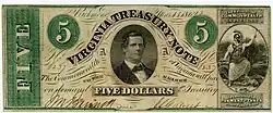 Confederate currency was mostly used in the eastern and southern counties, somewhat less in the central counties.[33] It was often used by Confederate officers to pay for goods taken during raids through Union-held territory. Many of the notes issued by Virginia during the war contained a portrait of Jonathan M. Bennett, the state auditor, and a native of Lewis County. Confederate bonds were also issued. The payrolls of West Virginia's Confederate soldiers would have provided much of the currency stock in the state.