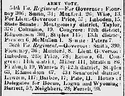 Records for the Confederate elections are sparse, only nine counties of West Virginia have a recorded civilian vote for the May 28, 1863 election; Logan 200, Greenbrier 318, Hampshire 32, Hardy 132, Mercer 213, Monroe 421, Pocahontas 213, Raleigh 108 and Pendleton 171. Morgan County was also reported to have voted but no returns were given.[65][66]