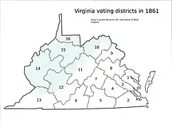 A number of senators and house delegates elected to represent West Virginia counties decided to remain loyal to Virginia and the Richmond government. The table for 1861–1863 lists these delegates and senators. The map shows the voting districts of Virginia, with the shaded section showing the area that became West Virginia. The county composition of those districts is as follows: District 10 includes Berkeley, Morgan, Hampshire, Jefferson and Hardy. District 11 includes Pendleton and Pocahontas. District 12 includes Mercer, Monroe, Greenbrier, Raleigh and Fayette. District 13 includes only McDowell. District 14 consists of Kanawha, Logan, Boone, Wayne, Cabell, Putnam, Mason, Jackson, Roane, Clay, Nicholas, Braxton, Wirt and Wyoming. District 15 consists of Lewis, Wood, Pleasants, Tyler, Ritchie, Doddridge, Upshur, Randolph, Webster, Tucker, Barbour, Harrison, Taylor, Gilmer and Calhoun. District 16 consists of Ohio, Hancock, Brooke, Marshall, Wetzel, Marion, Monongalia and Preston. Each district was entitled to choose one representative in the Congress of the Confederate States.[63] Results for Virginia's Confederate congressional elections from Nov. 6, 1861, have not been located, the only returns found are full returns for District 3, and partial returns for District 8.