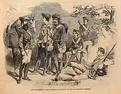 Although considered a loyal Union state by the Federal government, half of its soldiers were enlisted in the Confederate army; it was the only border state which did not give most of its soldiers to the Union.[4] While the Union army held much of the territory of the new state, large sections remained in the hands of guerrillas and bushwhackers. The Union army remained in West Virginia until 1869, and had dealt with civil unrest through 1868.[5]