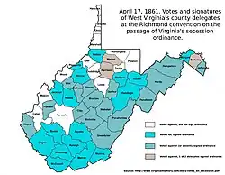 When the Richmond convention voted on April 17, 1861, to secede from the United States most of the delegates from the counties which became West Virginia voted against it; 32 against, 13 in favor, and 4 absent or abstained. The convention adjourned on May 1, to reconvene in June. With the movement of Union troops into West Virginia on May 26 the conditional Unionists threw their support to Virginia. Many delegates who had voted against the ordinance returned to the convention in June and signed it. Of the 49 delegates 29, representing 36 counties, signed the ordinance.[6] Benjamin Wilson, a delegate from Harrison County, was arrested at his home in Clarksburg in June and could not return, though he had previously signed the ordinance in April.[7] Some delegates, such as George Berlin of Upshur County, became refugees and settled in the Shenandoah Valley and other areas of Virginia beyond Union lines.[8] Burwell Spurlock of Wayne County was one of the last to sign the ordinance in November. A number of delegates entered Confederate service; Samuel Woods, John Echols, Franklin P. Turner, Napoleon B. French, Johnson Orrick, Alpheus F. Haymond, Currence B. Conrad, and Benjamin W. Byrne, among others.