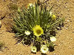 Conicosia is a genus of succulent plants in the ice plant family native to southern Africa. They are known commonly as narrow-leafed ice plants. These are relatively short-lived perennials with underground stems and tentacle-shaped, dull-pointed triangular leaves. They bear large tubular flowers often exceeding 10 centimeters in width, with up to 250 fringelike petals arranged in a ring around a center with hundreds of stamens. The fruit is a capsule which opens when it gets wet, slowly releasing the hundreds of tiny seeds as they fall out of its drying flesh.