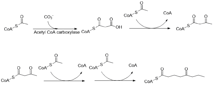 The biosynthesis of coniine is still being investigated, but much of the pathway has been elucidated. Originally thought to use 4 acetyl groups as feed compounds for the polyketide synthase that forms coniine,[44] it is in fact derived from two malonyl and a butyryl CoA, which are derived in the usual way from acetyl-CoA.[45]