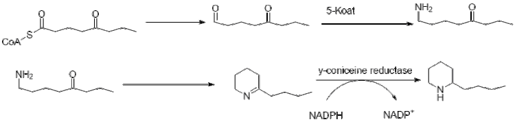 Further elongation of butyryl-CoA using 2 malonyl-CoA forms 5-ketooctanal. Ketooctanal then undergoes transamination using alanine:5-keto-octanal aminotransferase.[46] The amine then spontaneously cyclizes and is dehydrated to form the coniine precursor γ–coniceine. This is then reduced using NADPH dependent y-coniceine reductase to form coniine.