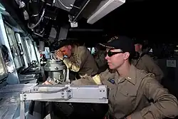Within the U.S. Coast Guard, Shipyard and U.S. Navy, the captain of a vessel typically selects a junior officer to perform the role of conning for him or her. Such an individual has the title of "officer of the deck" (abbreviated OOD) or "the conning officer" while on duty, and he or she will stand watches at four-hour intervals carrying out the captain's commands.[1] However, the captain can immediately take the conn by simply issuing an order to the helm. On navy ships, neither the ship's navigator nor the ship's pilot is usually the conning officer, whereas on merchant ships the conning officer may be the captain, the deck officer, the pilot, or another warrant officer. The officer of the deck may give the conn to a junior officer for training purposes, in which case the officer of the deck and the conning officer may not be the same individual (the officer who has the deck retains responsibility for the ship's safe passage; the conning officer only has responsibility for giving the helm instructions on direction and thrust of the ship's engines).[2]
