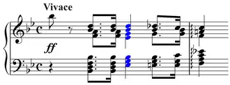 Due to the different tuning systems compared to modern times, the minor seventh and major ninth were "harmonic consonances", meaning that they correctly reproduced the interval ratios of the harmonic series which softened a bad effect.[52] They were also often filled in by pairs of perfect fourths and perfect fifths respectively, forming resonant (blending) units characteristic of the musics of the time,[53] where "resonance" forms a complementary trine with the categories of consonance and dissonance. Conversely, the thirds and sixths were tempered severely from pure ratios, and in practice usually treated as dissonances in the sense that they had to resolve to form complete perfect cadences and stable sonorities.[54]