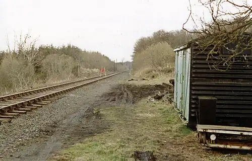 The OS map of 1856 shows only a short platform and a small building with a signal post on the opposite side of the lane to the later station.[1] By 1893 the OS map shows a station on the same northern side of the line but approached by a lane running off the lane and going to the east. A weighing machine is shown near the junction with the lane, several buildings and two signals. On the southern side are two fairly lengthy sidings, a loading dock and a small building set at the back of a sizeable goods yard that is accessed of the lane at the present day entry point.[2]