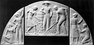 In 1937, Ortmayer was hired as instructor of sculpture at Rollins College by the president of the college, Hamilton Holt. As she was no longer employed by the government, Ortmayer was once again free to submit designs for approval. Ortmayer proceeded to enter a national competition for artists, receiving a runner-up position.[1] As such, she was commissioned to design two bas reliefs for federal post offices; one in Arcadia, Florida, which she completed in 1939, and one for Scottsboro, Alabama, completed in 1940.[1] The relief created for the Arcadia post office depicts a group of three adults (two men, one woman) and two children (a boy and a girl), along with a cow and her calf. The relief is entitled Arcadia[1] The second relief, created for the post office in Scottsboro, is a group of three different panels entitled Alabama Agriculture. The left panel depicts a man and a woman examining ears of corn. The middle and largest panel depicts cotton being harvested. The right panel depicts corn being harvested.[1] In 1941, Ortmayer was promoted from her original position as instructor of sculpture to assistant professor of sculpture. She was once again promoted, this time to associate professor, in 1945. In 1947, she was promoted to professor of sculpture.[1] During her time at Rollins, Ortmayer created a number of medals, most of which depicted then current and former members of the teaching staff at the college.[2] In 1968, Ortmayer resigned from Rollins college. She died, aged 85, having never married.[2]