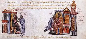 ![]() John the Orphanotrophos sends Ergodotes to Constantine Dalassenos, miniature from the Madrid Skylitzes | |