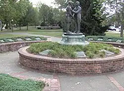 In the 1970s, Centre College president Thomas A. Spragens began a series of urban renewal projects in Danville using grants from the U.S. Department of Housing and Urban Development.[11] One such project was the expansion of Constitution Square and the restoration of some of its key features.[11] Part of First Street was closed to accommodate the expansion, and the African-American business district, which lay on Constitution Square facing the Ephraim McDowell House, was razed.[10][11] Grayson's Tavern, Fisher's row houses, the Goldsmith House, and the brick schoolhouse were renovated, and the Governor's Circle was added to the site.[11] A bronze statue depicting two men shaking hands, a symbol taken from the state seal, stands in the middle of the Governor's Circle.[11] Plaques that honor each governor of the state encircle the statue.[11] The entirety of the Governor's Circle honors Isaac Shelby, Kentucky's first and fifth governor.[10] Shelby is believed to be responsible for Kentucky's adoption of the motto "United we stand, divided we fall", which also appears on the state seal.[10] The landscaping around the circle is maintained by the Garden Club of Danville.[12]