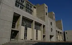 The main building of the engineering faculty of Kyushu Imperial University is a three-story reinforced concrete building and tower. It was designed by Ken Kurata (倉田謙); construction began in November 1928 and was completed in November 1930 by Shimizu gumi (清水組).[43] The office of Kyushu University Institute for Advanced Study (高等研究院 Kōtōkenkyūin) is located in the first-floor room 107.[44] The Department of Aeronautical Engineering in the School of Engineering is located in a three-story reinforced concrete building and tower, which housed the ATCT.[5][45] It was designed by Harusaburō Shimaoka and Yoshikatsu Tsuboi and was completed in March 1939.[5] The Hakozaki campus' existing main gate was the main gate (九州帝國大學工科大學正門) of Kyushu Imperial University School of Engineering. It was constructed in 1911 and was made of brick.:[46] The gate is a representative architecture of Kyushu University, it is often depicted on the cover of pamphlets from Kyushu University. It was constructed in 1922, but its designer and construction company are not known.[47] The wall of used brick surrounds the science area of Hakozaki campus. It is used as location of the movie K-20 Kaijin nijyu-menso-den (K-20 怪人二十面相・伝) in 2008.[48]