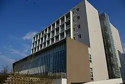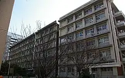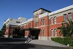 Many buildings at Kyushu University have an architectural style dating back to the Imperial University era. Basic Medical Research Building A was formerly the first, second, and third medical classrooms as well as the hospital ward of Kyushu Imperial University Medical School. These buildings were designed by Engo Iwasaki and Ken Kurata and construction was completed in April 1931. Since their renovation, the ground floor houses have been used as a cafeteria.[21][5][22] Basic Medical Research Building B was formerly the School of Forensic Medicine, Bacteriology, and Hygiene. This three-story building was constructed in 1935 by the Kaneko Group.[23] Dental School Clinical Research Building was formerly the Dental Surgery and Orthopedic Surgery Building. This building, designed by Shūzō Kunitake, was completed in 1934. The gatehouse at the main gate was formerly the gatehouse of Kyoto Imperial University Fukuoka Medical School. This tile-roofed wooden house is the oldest remaining structure in Kyushu University. It was designed by the local office of the Education Ministry's architecture department and built in 1903.[24] The First Surgery Department and Ward is a three-story concrete building and was designed by Ken Kurata and completed in May 1927.[25] After eight decades it was dismantled.[5][26]