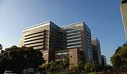 The new University Hospital was constructed in three stages.[5] It has twelve floors; eleven are above ground and one is underground, with a total floor space of approximately 118,000 square metres (1,270,000 sq ft). Construction started in April 1998 and was finished by March 2008. It is the largest hospital under the jurisdiction of the Ministry of Education, Culture, Sports, Science, and Technology, and the first one to have a seismic isolation system.[5][6] The Outpatient Ward has six floors, five above ground and one underground, and houses 28 departments.[5] The Westwing Building was constructed in March 2008.[5] It houses the Yusho Dioxine Research and Care Center[7] and the Training Center for Minimally Invasive Surgery.[8] The Tumor Center was completed in 1985. The Betatron Ward was constructed in 1967 and closed in 2000.