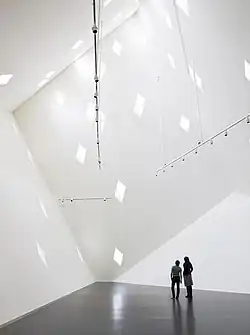 Critic Christopher Hawthorne of the Los Angeles Times praised Libeskind for a "careful balance of explosive and well-behaved forms" and gallery designs that abandon the architect's characteristic slanted walls.[12] Likewise, David D'Arcy of The Wall Street Journal saw the museum as a laudable departure from Libeskind's previous work, finding a "lightness to this [museum] that is rare in the architect's work" and that "relieves the surrounding district's glass and steel tourist-mall monotony."