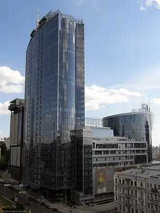 It is located at the very center of the city near Palats Sportu metro station (municipal address: 1, Sportyvna Sq). It is the second-highest building and the highest office building in the country.[4]