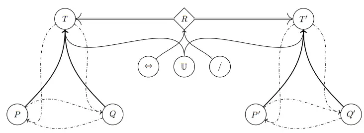Represents two solid arcs permitting alternative derivations of the topic T. This can be expressed as , which reads either the set containing P and Q, or the set containing R and S entail T. Lastly, a formal analogy is shown where two topics T and T' belonging to two entailment meshes are demonstrated to have a one-to-one correspondence with each other. The diamond shape below denotes analogy relation that can be claimed to exist between any three topics of each entailment mesh.