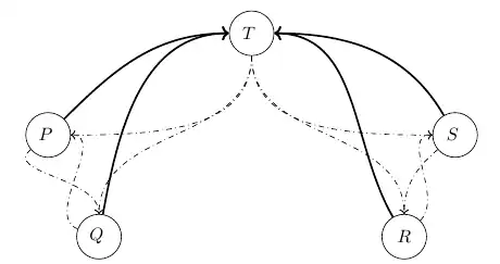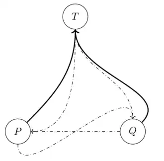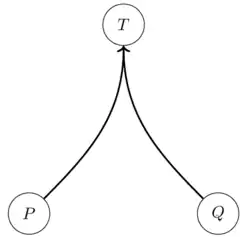 In the above illustration, let , such that there are topic relations that are members of a set of topic relations. Each topic relation is represented by a node, and the entailment represented by the black arc. It follows that in the case above, such that the topics P and Q entail the topic of T.