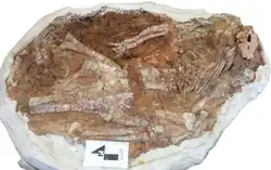 The holotype, SMU 72834, was found in a layer of the Twin Mountains Formation dating from the Aptian. It consists of a partial skeleton with skull. It preserved the cranium with the lower jaws, the vertebral column up to the twenty-third tail vertebra, the shoulder girdle, the left arm, the right humerus, the pelvis, both thighbones, both shinbones and the left calfbone. It represents a subadult individual.[1] A large amount of fossils have been referred to the species. In 2019 these amounted to 488 specimens, representing at least twenty-nine individuals, ranging from small juveniles to subadults. Almost the entire skeleton is now known.[1]