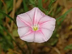 This bindweed is a hemicryptophyte scapose plant reaching on average 20–50 centimetres (7.9–19.7 in) in height. It has simple, alternate, lanceolate leaves, coarsely hairy on both sides. The wide funnel-shaped flowers are actinomorphic ("star shaped", "radial") and arranged on a long petiole at the leaf axils. The corolla is 15–25 mm long and usually pale pink, but it can be completely white. The flowers are hermaphrodite and pollinated by insects (entomogamy). The flowering period extends from May through October. The fruits are globose and pubescent capsules with 2–4 brownish seeds.