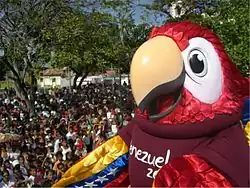Venezuela 2007 Guaky A scarlet macaw, a bird representative of Venezuela. He wore the traditional burgundy jersey of the Venezuela national football team. His wings have the tricolor national flag, as well as its eight stars on them. [1]