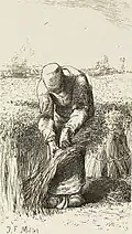 ![]() | ![]() Peasant Woman Binding Sheaves 1889 Van Gogh Museum, Amsterdam, Netherlands (F700) | In Peasant Woman Binding Sheaves (after Millet) Van Gogh's work shows it is beautiful for its simplicity and appreciation of nature. The woman's expression is hidden to us and appears like one of the waiting bundles of wheat. The true focus of the scene is the woman's bent back.[55] |