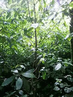 Kanono is found in wet and shaded forest areas where it can grow to 6 metres high, with a slender trunk and stout branches. Leaves grow up to 15 cm long with 2 cm or longer stalks.[4]