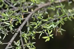The branches are generally horizontal, and the leaves are opposite, giving this Coprosma a distinctive appearance. There are minute hairs between the leaves on the steam, which can be seen with a hand lens.[2]