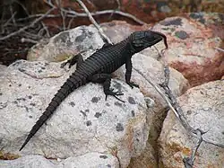 Cordylus niger, the black girdled lizard, is a medium-sized lizard restricted to Table Mountain on the Cape Peninsula and a second, isolated population near Langebaan.