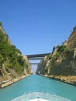 The Isthmus of Corinth (Greek: Ισθμός της Κορίνθου) is the narrow land bridge which connects the Peloponnese peninsula with the rest of the mainland of Greece, near the city of Corinth. The 6.3 km (3.9 mi) wide Isthmus was known in the ancient world as the landmark separating the Peloponnese from mainland Greece. In the first century AD the geographer Strabo[1] noted a stele on the Isthmus of Corinth, which bore two inscriptions. One towards the East, i.e. towards Megara, reading: "Here is not Peloponnesus, but Ionia" (τάδ᾽ οὐχὶ Πελοπόννησος, ἀλλ᾽ Ἰωνία) and the one towards the West, i.e. towards the Peloponnese: "Here is Peloponnesus, not Ionia" (τάδ᾽ ἐστὶ Πελοπόννησος, οὐκ Ἰωνία); Plutarch ascribed the erection of the stele to the Attic hero Theseus, on his way to Athens.[2]