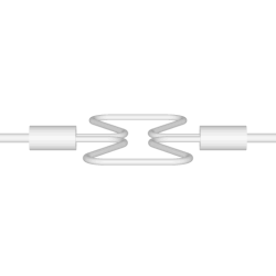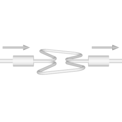 The animation on the right represents how curved tube mass flow meters are designed. The fluid is led through two parallel tubes. An actuator (not shown) induces equal counter vibrations on the sections parallel to the axis, to make the measuring device less sensitive to outside vibrations. The actual frequency of the vibration depends on the size of the mass flow meter, and ranges from 80 to 1000 Hz. The amplitude of the vibration is too small to be seen, but it can be felt by touch.