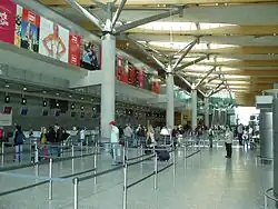 The main terminal at Cork Airport contains several shopping and eating facilities both before and after the security screening area, a bureau de change kiosk and ATM (cash machine) and a business lounge operated by Swissport. There are eight departure gates in the airport, two of which have an airbridge.[18] Wi-Fi is available throughout the terminal.[19]
