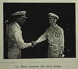 The President of the United States of America takes pleasure in presenting the Navy Cross to Lieutenant [then Lieutenant, Junior Grade] Cornelius Nicholas Nooy, United States Naval Reserve, for extraordinary heroism in operations against the enemy while serving as Pilot of a carrier-based Navy Fighter Plane in Fighting Squadron THIRTY-ONE (VF-31), attached to the U.S.S. CABOT (CVL-28), in action against enemy Japanese Forces in the Pacific War Area, on 4 July 1944. Participating in the initial fighter sweep over the Japanese-controlled Bonin Islands, Lieutenant Nooy fought his plane gallantly against the enemy, dived from an altitude of ten thousand feet to destroy a hostile fighter which was attacking a friendly plane about fifty feet above the coast. During this same action Lieutenant Nooy shot down three other enemy aircraft and probably destroyed a fourth. By his fighting spirit, initiative and courage, Lieutenant Nooy contributed materially to the success of our operations in this area and upheld the highest traditions of the United States Naval Service.
