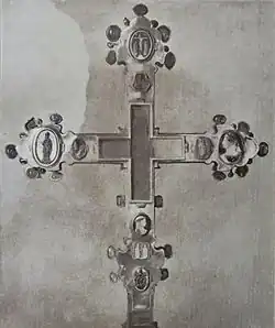 The cross was made of gold plates by court goldsmiths. The entire front is covered with a rock crystal plate that allows one to see the relics of the Crucifixion of Christ: wood from the Holy Cross, thorns, a part of the sponge, rope, and a nail. The sides of the cross are lined with sapphires that are set in such a way so that light could penetrate them, thus creating a halo. The back of the cross is adorned with engraved gem cameos with beautiful reliefs that date from antiquity to the 12th century and cover small compartments for other precious relics. In the middle of the back of the cross, there is a small rock crystal window with another part of the wood from Christ's cross.[2]