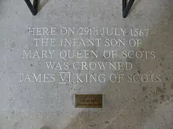 Annabell Murray, Countess of Mar brought Prince James down from the castle to the Holy Rude Kirk on the afternoon of 29 July for the three hour ceremony.[11] His mother had been crowned at 9 months of age in the chapel in Stirling Castle on 9 September 1543.[12]