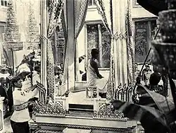 King Prajadhipok (Rama VII)'s coronation ceremony was scheduled for 25 February 1926. Unlike his predecessors, he wanted to wait until after the royal funeral and mourning period of the previous king (his brother had died on 26 November 1925) had come to an end. The coronation ceremony took three days, the state progress on land then took place on 1 March and the state progress on water on 3 March.[2] Prince Devawongse Varopakarn wrote to the Japanese ambassador that King Rama VII's coronation ceremony: "Will only be one ceremony, for reasons of economy, and it will be on a simpler scale than hitherto. Special envoys from foreign countries have not been invited, but there will be no objection to the foreign envoys already in this country being so appointed for the occasion." Nevertheless, envoys from forty-seven different countries attended, and the ceremonies were completed in full. For the first time a book and several photographs of the ceremony were published by the Royal Household. An 11 minutes and 8 second silent film of the coronation ceremonies was made by the Royal State Railways of Siam with intertitles in both Thai and English.[25]