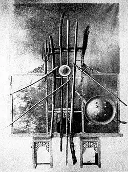 The eight weapons of sovereignty (พระแสงอัษฎาวุธ) are: the Long spear (พระแสงหอกเพชรรัตน์), the Long-handled sword (พระแสงดาบเชลย), the Trident (พระแสงตรี), the Chakra (พระแสงจักร), the Short sword with Buckler (พระแสงเขนมีดาบ), the Bow (พระแสงธนู), the Elephant goad spear (พระแสงของ้าวพลพ่าย), and the Gun of Satong (พระแสงปืนคาบชุดแม่น้ำสโตง). Some of the oldest items of regalia in ancient India are weapons, the main four being the bow, the spear, the trident, and the chakra. The weapons are symbolic of the divine weapons of Shiva and Vishnu, mentioned in the Shatapatha Brahmana. The current set of weapons were all created during the reign of King Rama I, as reproductions of lost originals. Apart from the sacred weapons, the others are symbolic of the martial exploits of King Naresuan of Ayutthaya.[58]