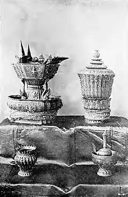 The royal regalia of Thailand (เครื่องราชกกุธภัณฑ์แห่งประเทศไทย) are objects accumulated by the kings of Thailand for use during their coronation ceremonies. Most were assembled around 1785 for the second coronation ceremony of King Rama I. The combination of these regal and practical objects, and their symbolism, trace back to the ancient Indian subcontinent and are replicated by many monarchies within the Greater Indian cultural sphere.[43][44]