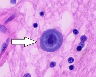 ![]() Histopathology of a corpus arenaceum in cerebral white matter | |