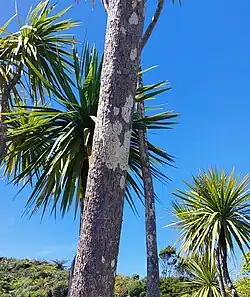 A corticolous lichen is a lichen that grows on bark.[1][2] This is contrasted with lignicolous lichen, which grows on wood that has had the bark stripped from it,[3] and saxicolous lichen, which grows on rock.[4]