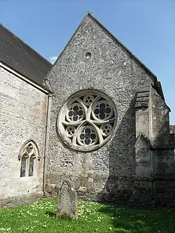 The south Giffard chapel has a fine three-light east window, and its oversized west wheel window is called a tour-de-force by Pevsner; Julian Orbach, expanding Pevsner's description, compares its tracery to the 1260 work in Salisbury Cathedral's cloisters, and notes the local connection to Walter Giffard, Archbishop of York.[11] The glass in both windows was lost when the church fell into disrepair, and was replaced by pieces from elsewhere.[13] The chapel also has a 13th-century sedilia and piscina.[9]