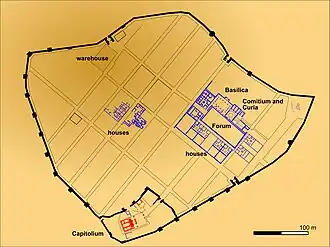 Within the city walls the urban area was divided into an orthogonal plan, with space allotted for civic, sacred, and private architecture.[15] The plan represents a subtle adaptation of an orthogonal plan to the complicated topography of the hill. The forum was found on a saddle between two heights, with the sacred area, with the Capitolium, linked to it by a broad street. Recent excavations have suggested that the original layout provided for about 248 houses, of which 20 were intended for the decurions, and were double the size of the houses of the ordinary citizens. The larger houses were found on the forum and the main processional streets.[13]