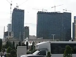 A groundbreaking ceremony was held on October 25, 2005.[13][14][15] Perini Building Company served as general contractor.[16] The Cosmopolitan was built on 8.5 acres,[3] considered small in comparison to most Strip resorts. The minimal acreage necessitated a vertical design.[17][18] In January 2006, Deutsche Bank provided a $415 million loan to finance excavation for an underground parking garage.[16] Perini spent approximately a year excavating 60 feet below ground.[19][20][21] Construction on the hotel towers began on April 9, 2007, with the placing of the first steel beam. In total, the project would use 41,000 tons of steel.[19][22]