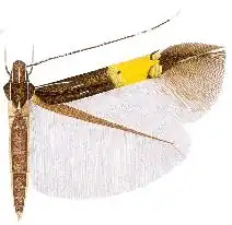 Male. Forewing length 4.1 mm. Head: frons shining pale ochreous-grey with greenish and reddish reflections, vertex and neck tufts shining dark bronze brown with greenish and reddish gloss, laterally and medially lined white, collar shining dark bronze brown with greenish and reddish gloss; labial palpus first segment very short, white, second segment three-quarters of the length of third, dark brown with white longitudinal lines laterally and ventrally, third segment white, lined brown laterally; scape dorsally dark brown with a white anterior line, ventrally white; antenna shining dark brown, with an interrupted white line from base to beyond one-half, followed towards apex by six dark brown segments, four white, two dark brown, two white, ten dark brown and seven white segments at apex. Thorax and tegulae shining dark bronze brown with reddish gloss, thorax medially with a short white posterior line, tegulae narrowly lined white inwardly. Legs: shining dark brown with reddish gloss, femora of midleg and hindleg shining ochreous-grey with golden reflection, foreleg with a white line on tibia and tarsal segments one, two, base of segment three and segment five, tibia of midleg with white oblique basal and medial lines and a white apical ring, midleg with tarsal segment one with white longitudinal line on outside from base to dorsum at apex, segment two with a white dorsal line in apical half, segments five dorsally white, tibia of hindleg as midleg, tarsal segments one and two with indistinct ochreous dorsal spots, segment three with white dorsal spot, segment four dorsally white and segment five entirely white, spurs dark brown with purplish gloss and with a longitudinal white streak. Forewing shining dark bronze brown with reddish gloss, three white lines in the basal area, a subcostal from base to one-quarter, bending from costa distally, a very short medial above fold, ending beyond apex of subcostal, a subdorsal, shorter than the medial and starting slightly further from base than the latter, a yellow transverse fascia beyond the middle with a very short apical protrusion, narrowed towards dorsum, bordered at the inner edge by a tubercular pale golden metallic fascia with greenish and purplish reflections, subcostally on the outside with a blackish spot, bordered at outer edge by two tubercular pale golden metallic costal and dorsal spots with greenish reflection, the dorsal spot about twice as large as the costal and more towards base, both spots irregularly lined dark brown on the inside, the costal spot outwardly edged by a narrow white costal streak, a shining blue apical line from the distal half of the apical area, shining white in the cilia, cilia dark brown, paler towards dorsum. Hindwing shining dark greyish brown with reddish gloss, cilia brown. Underside: forewing shining dark brown with greenish reflection, the white spot at apex distinctly visible, hindwing shining dark greyish brown. Abdomen dorsally brown, laterally shining pale grey with greenish reflection, ventrally dark greyish brown, segments broadly banded shining yellowish white posteriorly, in middle completely yellowish white, anal tuft pale brownish grey.[1]