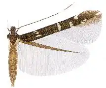 Male. Forewing length 3.3-3.9 mm. Head: frons shining pale golden metallic, vertex and neck tufts shining dark bronze brown with some reddish reflection, laterally lined white, collar shining dark bronze brown; labial palpus first segment very short, ochreous-grey, second segment two-thirds of the length of third, dark brown with white longitudinal lines laterally and ventrally, third segment white, lined dark brown laterally, extreme apex white; scape dorsally dark brown with a white anterior line, ventrally white, antenna shining dark brown with a white interrupted line from base to one-half with a short uninterrupted section at base, a subapical white section of seven segments, followed by a dark brown section of about twelve segments, apical three segments white. Thorax and tegulae shining dark bronze brown with reddish gloss, tegulae broadly lined pale golden metallic inwardly.