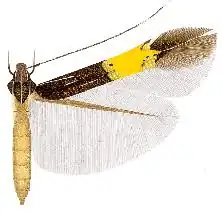 Female. Forewing length 3.7 mm. Head: frons shining pale ochreous-grey with greenish reflection, vertex and neck tufts shining brown with reddish gloss, medially and laterally lined white, collar shining dark brown; labial palpus first segment very short, greyish white, second segment three-quarters of the length of third, dark brown with white longitudinal lines laterally and ventrally, third segment white, lined dark brown laterally, extreme apex white; scape dorsally shining dark brown with a white anterior line, ventrally shining white, antenna shining dark brown with a short white line from base to one-fifth, changing into an interrupted line to beyond one-half, followed towards apex by approximately five dark brown segments, eight white, eight dark brown and eight white segments at apex. Thorax and tegulae shining dark brown with reddish gloss, thorax with a white median line, tegulae lined white inwardly. Legs: shining dark brown, femora of midleg and hindleg with pale golden reflection, foreleg with a white line on tibia and tarsal segments one to three and five, tibia of midleg with white oblique basal and medial lines and a white apical ring, tarsal segments one and two with white apical rings, segment five entirely white, tibia of hindleg as midleg, but with an additional pale golden subapical band, tarsal segments one to three with white apical rings, segments four and five dorsally white, spurs white dorsally, dark brown ventrally. Forewing shining dark brown with reddish gloss, four narrow white lines in the basal area, a subcostal from base and slightly running from costa to one-quarter, a very short medial to the end of the subcostal, a subdorsal, slightly longer than the medial, starting at end of the medial, a short dorsal from beyond base to the start of the medial, a bright yellow transverse fascia beyond the middle with an apical protrusion, bordered at the inner edge by two large tubercular golden metallic costal and dorsal spots almost forming a fascia, the costal spot with a patch of blackish scales on the outside, the dorsal spot slightly further from base than the costal, bordered at the outer edge by two tubercular golden metallic costal and dorsal spots, the dorsal spot three times as large as the costal, both spots inwardly lined dark brown, a white costal streak from the outer costal spot, a narrow shining white apical line from the apical protrusion, widening in the apical cilia, cilia dark brown. Hindwing shining dark greyish brown, cilia dark brown. Underside: forewing shining dark greyish brown, the white apical spot distinctly visible in the apical cilia, hindwing shining dark greyish brown. Abdomen dorsally shining pale yellow-ochreous, especially segments two to five, remaining parts greyish brown, ventrally shining yellowish white, anal tuft dorsally greyish brown, ventrally ochreous.[1]