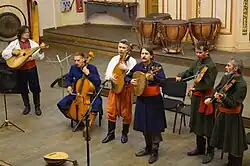 Cossack's songs of Dnipropetrovsk Region (Ukrainian: Козацькі пісні Дніпропетровщини), which are Zaporozhian Cossack songs of Dnipropetrovsk Oblast, are listed as an intangible cultural heritage in need of urgent safeguarding.[5][6][7] Work on the nomination dossier for the inscription of Cossack songs in the UNESCO Intangible Cultural Heritage List began in 2014. On 28 November 2016, the Committee for the Protection of Intangible Cultural Heritage List included Cossack's songs of the Dnipropetrovsk region on the List of Intangible Cultural Heritage in Need of Urgent Safeguarding. According to the committee, these works, sung by Cossack communities in the region, talk about the tragedy of war and the personal experiences of soldiers. The lyrics maintain spiritual ties with the past, but are also entertaining. Cossack songs traditionally involve male singing.[8] Cossack songs are nowadays often performed by women, but rarely in mixed groups. UNESCO's list mentions the choral groups Krynytsia, Bohuslavochka, and Pershotsvit.[9][10] The settlements of Kocherezhky, Bohuslav, Pidhorodnie, Shulhivka, and Sorochyn retain the tradition.[5][11]