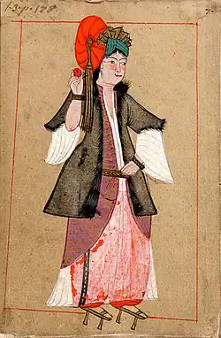 There are not many records of women's clothing at the time, but artwork can provide some understanding. Headdresses were typically tall, pointed hats with a veil attached to them, which served to cover their faces during outings. In depictions of sultanas, their clothing is mostly fabricated with few references to what Ottoman women actually wore. A portrait of Roxelana depicts her wearing a pillbox-shaped headdress with decorative jewels on the border. While her headdress illustrates popular styles in Ottoman women's headwear at the time, her clothing remains very similar to European-style clothing. This was a popular way to depict women, specifically sultanas.[3]