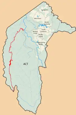 The river rises on the eastern slopes of the Brindabella Ranges in the south-west of the Australian Capital Territory (ACT), within Namadgi National Park, and flows generally north, joined by six minor tributaries, including Paddys River, before reaching its confluence with the Murrumbidgee River, near Casuarina Sands, west of the suburb of Weston Creek. The river descends 1,300 metres (4,300 ft) over its 76 kilometres (47 mi) course.[2]