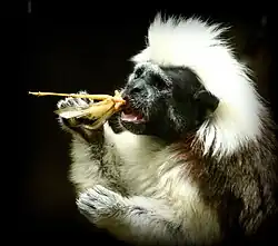 The cotton-top tamarin has a diet of mainly fruit (40%) and animal material (40%).[15] This includes insects, plant exudates such as gum and sap, nectar, and occasionally reptiles and amphibians. Due to its small body size and high food passage rate, its diet must be high-quality and high-energy. Insectivory is common in the cotton-top and the species hunts for insects using a variety of methods: stealth, pouncing, chasing, exploring holes, and turning over leaves.[14]