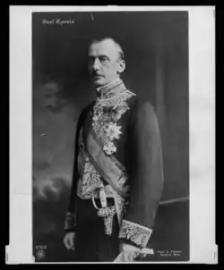 Before the war, Count von Czernin served as a Counselor to the Embassy in St. Petersburg and served as Chargé d'Affaires during the first weeks of the July Crisis as the Ambassador Count von Szapáry was absent due to the illness of his wife. He was therefore in charge of dealing directly with Russian Foreign Minister Sazonov until Count Szapáry returned to the Russian capital in mid-July.[2]